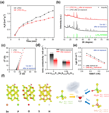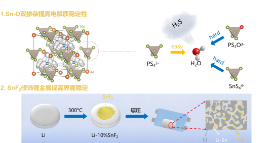 基于此,西安电子科大学李思吾副教授与华中科技大学余创教授合作,通过SnO2掺杂形成Li5.58P0.92Sn0.08S4.34O0.16Cl1.5电解质,从而提高Li5.5PS4.5Cl1.5的性能。Sn和O掺杂剂的引入在电解液中形成了稳固的Sn-S和P-O键,取代了敏感的P-S键,抑制了H2S的释放。此外,该掺杂电解质表现出令人印象深刻的锂离子电导率5.71 mS cm−1, 2.9 mA cm−2的高临界电流密度,并显着改善了空气和水分稳定性。此外,锡掺杂剂在裸露的锂金属阳极上形成Li-Sn合金层,赋予ASSB在0.2C下146.7 mAh/g的初始放电容量,在0.5C下循环200次后的容量保持率为86.2%。结合10 wt. % SnF2处理的锂金属阳极,通过原位形成的Li-Sn和LiF衍生物进一步加强电极界面稳定性,得到的全电池在0.2C时具有179.5 mAh/g的初始放电容量,在0.5C下循环300次后仍具有112.2 mAh/g的高放电容量。电解质掺杂和锂阳极改性的双重策略实现了协同效应,使全固态电池表现出优越的电化学性能,为硫化物基锂金属全固态电池大规模应用提供了制备稳定电解质及界面的有效途径。