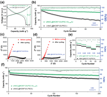 Li5.5PS4.5Cl1.5作为硫化物电解质之一,由于其超高的导电性,在全固态电池中作为固态电解质具有显著的优势。然而,它们的实际应用受到空气稳定性差和与锂金属相容性弱的限制。本文以电解质掺杂和修饰锂金属为策略,提高电解质的空气稳定性以及电解质与锂金属间的界面兼容性,以提高硫化物全固态锂金属电池的综合性能。在Li5.5PS4.5Cl1.5电解质中掺杂SnO2的策略主要提高了其空气稳定性,并改善了与锂金属的相容性。这有利于用以下材料组装的ASSLMBs的电化学性能LiNbO3@NCM712阴极和掺杂电解质。随后,用质量比为10 %的SnF2(表示为Li-10%SnF2)处理的Li金属进一步提高了固态电解质和Li金属之间的相容性。使用改性锂金属和掺杂电解质组装的ASSLMBs显示出增强的电化学性能。这种双重改性方法显示出协同效应,有望在未来开发出具有更高能量密度和改善循环性能的ASSLMBs。