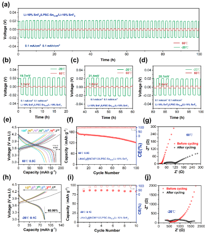 图5.基于锡基双改性的对称电池和全电池在宽工作温度范围内的性能测试