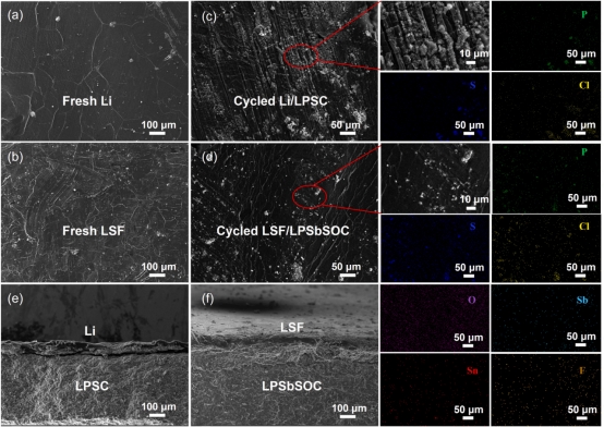 基于此,西安电子科技大学李思吾副教授与华中科技大学杨辉教授、余创教授合作,创新性地提出“复合阳极+功能电解质”的双重保护策略,构建了具有高锂亲和力与高界面能的Janus界面。一方面,作者通过熔融锂金属与SnF₂反应,形成由Li、Li₂₂Sn₅合金和LiF组成的复合结构。其中,Li₂₂Sn₅合金构建快速电子/离子传导网络,优化锂离子体相扩散;LiF凭借高界面能延缓锂枝晶生长,起到“疏通”锂离子分布的作用。另一方面,作者在Li₅.₅PS₄.₅Cl₁.₅硫化物电解质中引入Sb和O元素,使其与锂金属接触时原位生成Li-Sb合金界面。该界面不仅加速锂离子迁移,还能在高电流密度下主动消耗穿透的锂枝晶,形成稳定阻挡层,发挥“阻断”功能。实验结果显示,采用双重修饰策略的对称电池在0.5 mA/cm²下稳定循环1400小时,过电位仅从10 mV缓慢增至29 mV;临界电流密度(CCD)高达5.2 mA/cm²,远超单一修饰策略(1.8-3.5 mA/cm²)。全电池测试中,基于LiNi₀.₇Co₀.₁Mn₀.₂O₂正极的ASSLMB在0.5C倍率下循环700次后容量保持率达70%,且在-20°C至60°C宽温域内表现优异,高温(60°C)循环150次容量保持90%,低温(-20°C)循环90次仍保有80%容量。